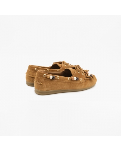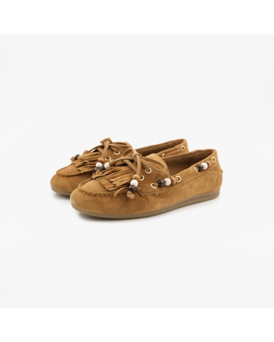 Mocassins ANAHI de couleur cognac ornés de perles à effet ambré et d'oeillets dorés.