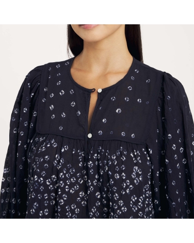 Son encolure carré structurée et son plastron orné de boutons en nacre apportent une touche raffinée, tandis que les manches bouffantes et le volume du bas créent un mouvement fluide et féminin.